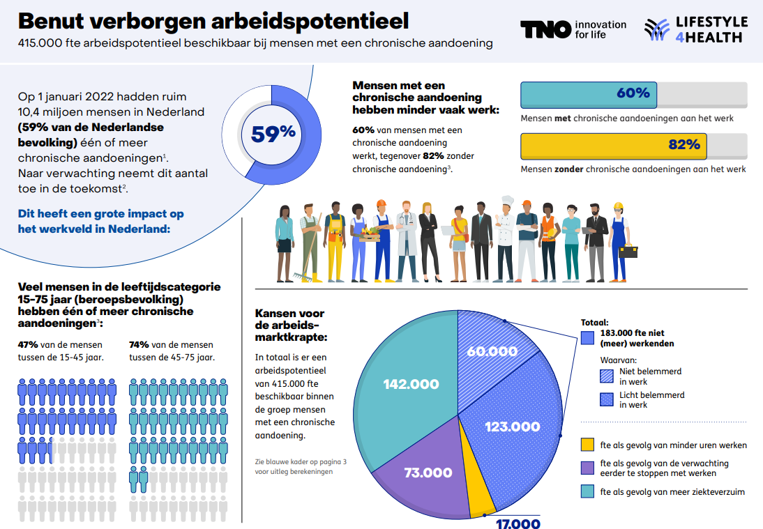 TNO heeft een mooie factsheet gemaakt over het arbeidspotentieel van chronisch zieken. ‘In Nederland is er circa 415.000 fte beschikbaar binnen de groep mensen met een chronische aandoening. Het grootste potentieel (183.000 fte) ligt binnen de groep die niet meer werkt, terwijl zij zelf aangeven dat ze dit wel kunnen’: Groot arbeidspotentieel bij mensen met chronische aandoening Pagina 1 van de factsheet staat hieronder: